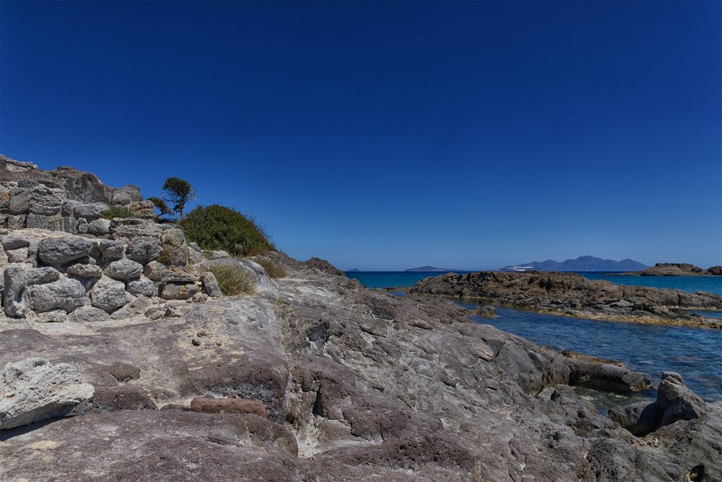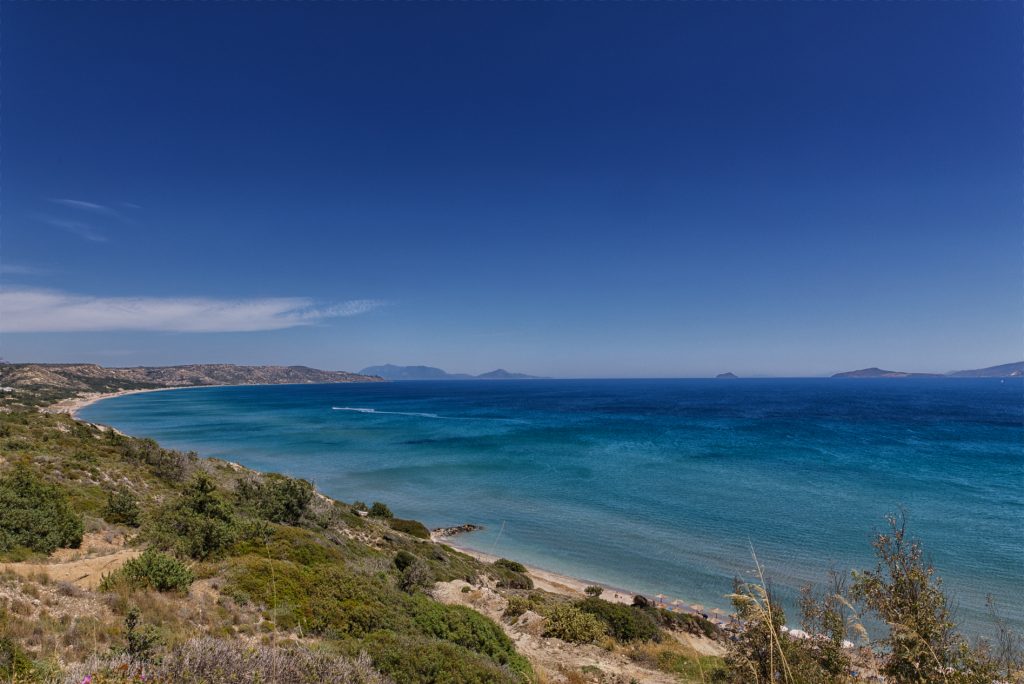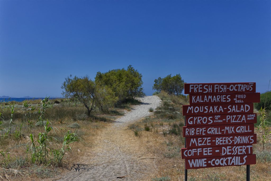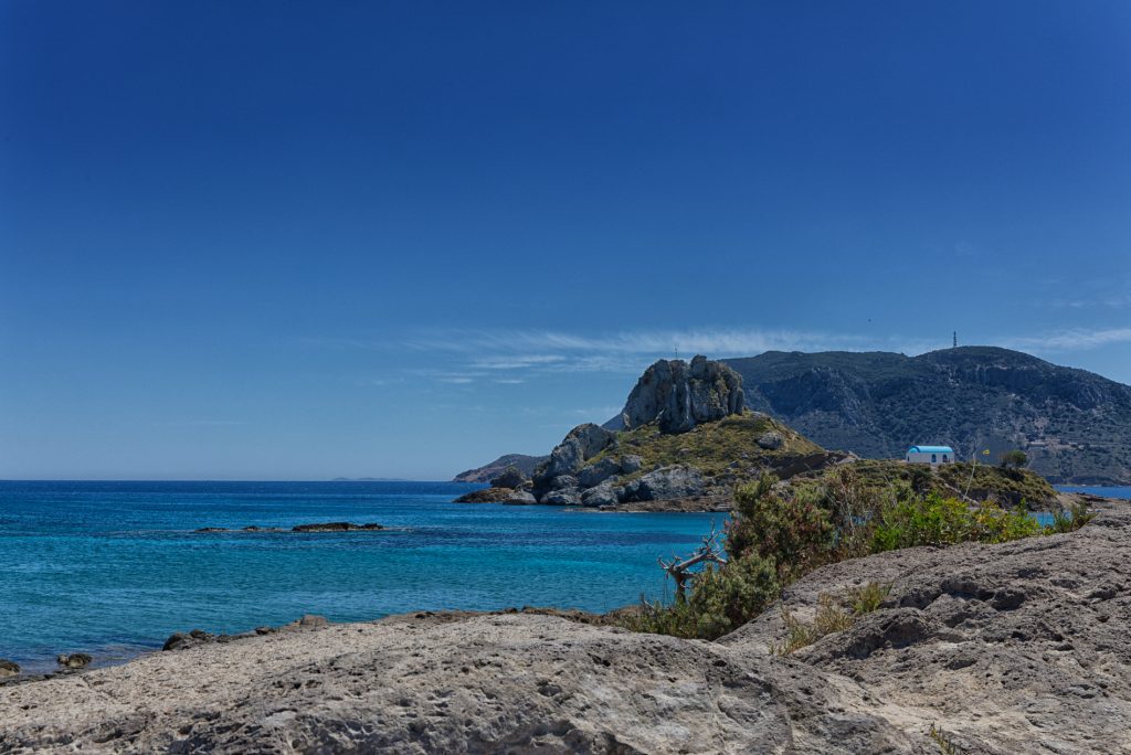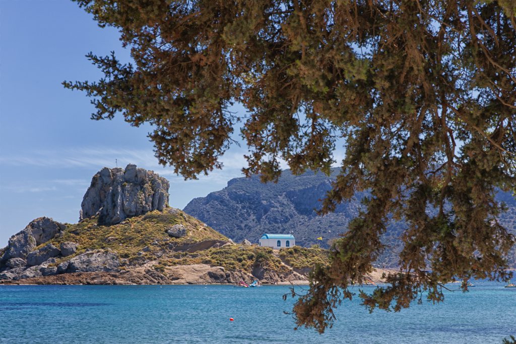 Die direkt am Strand gelegene Ausgrabungsstätte der Agios-Stefanos-Basilika und die malerisch in der Bucht von Kefalos vorgelagerte Insel Kastri machen diesen Strand zu einem besonderen Highlight der Insel Kos. So unspektakulär der Strand an sich ist, wird er durch die Umgebung zu etwas Besonderem. Er ist besonders bei Familien beliebt, da das Wasser hier sehr flach und ruhig ist. Bis nach Kefalos sind es etwa 2,5 Kilometer. Oberhalb dieses Strandabschnitts machen wir es uns in einer Taverne gemütlich, die zwar an der Hauptstraße liegt, aber einen tollen Blick über die Bucht und den Golf von Kefalos bietet.