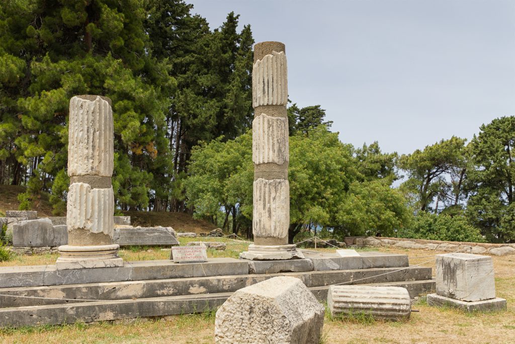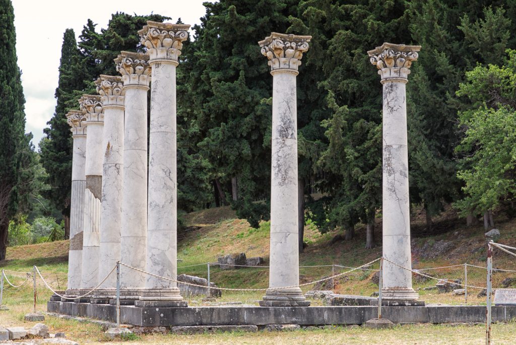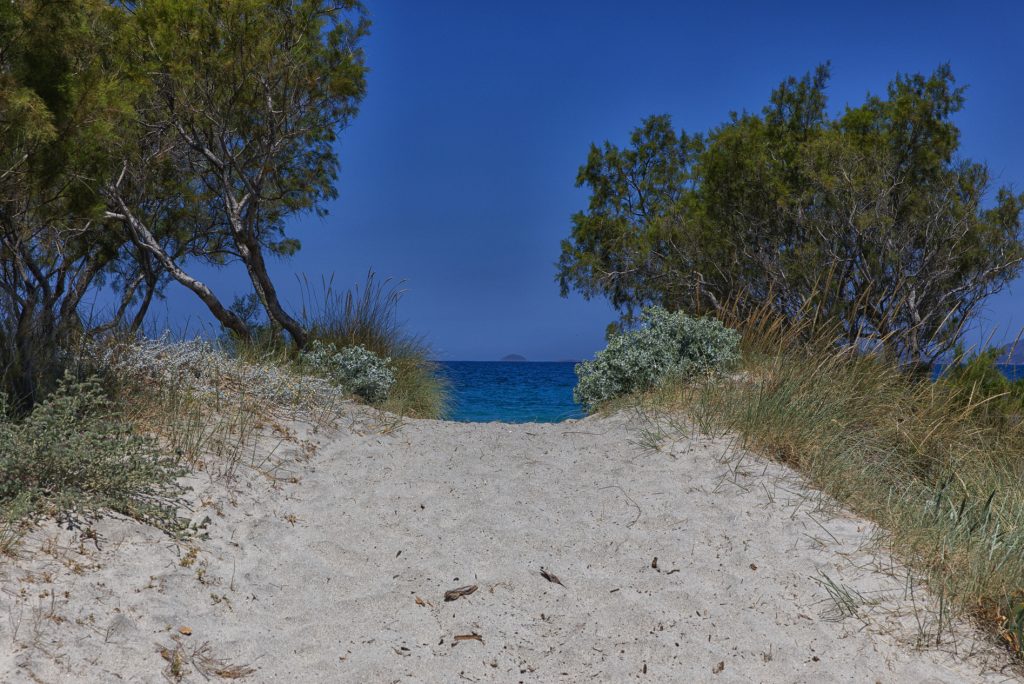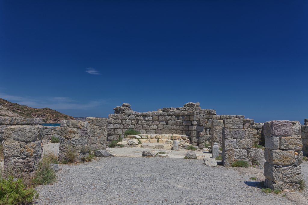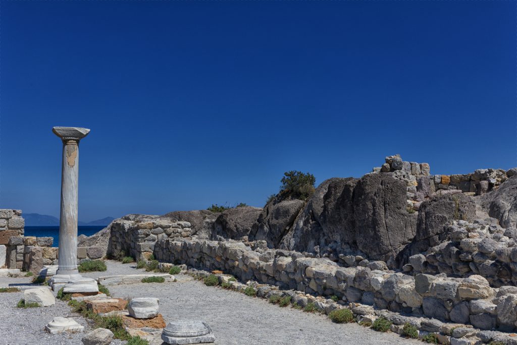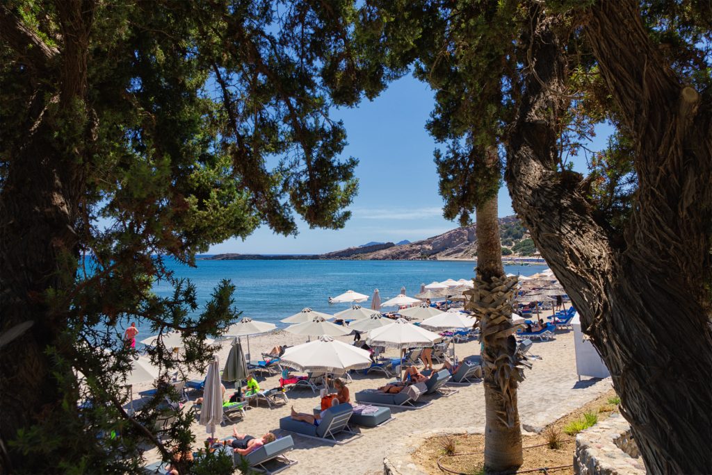 Die direkt am Strand gelegene Ausgrabungsstätte der Agios-Stefanos-Basilika und die malerisch in der Bucht von Kefalos vorgelagerte Insel Kastri machen diesen Strand zu einem besonderen Highlight der Insel Kos. So unspektakulär der Strand an sich ist, wird er durch die Umgebung zu etwas Besonderem. Er ist besonders bei Familien beliebt, da das Wasser hier sehr flach und ruhig ist. Bis nach Kefalos sind es etwa 2,5 Kilometer. Oberhalb dieses Strandabschnitts machen wir es uns in einer Taverne gemütlich, die zwar an der Hauptstraße liegt, aber einen tollen Blick über die Bucht und den Golf von Kefalos bietet.
