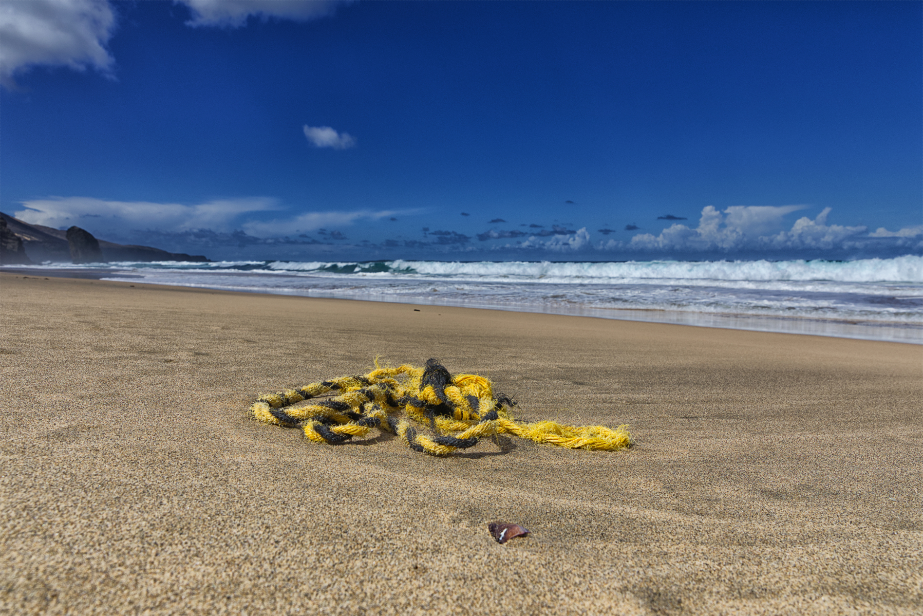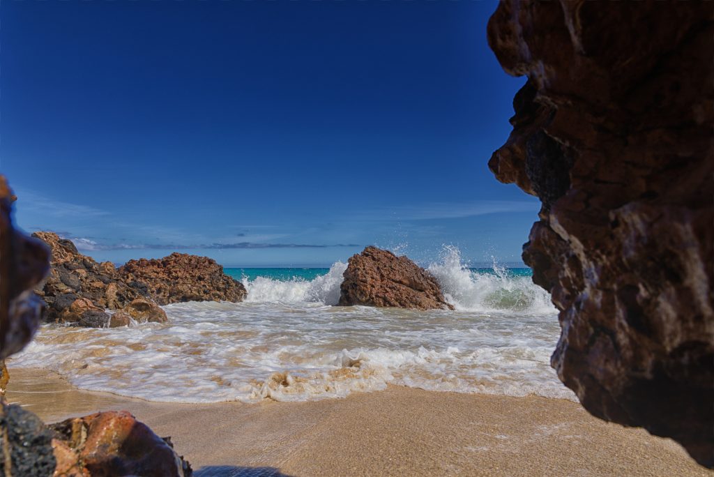 Am frühen Nachmittag fahren wir dann über die Insel zur Westseite in den kleinen Fischerort Ajuy. Schwarzer Strand, steile Küste, Piratenhöhlen, leckeren Fisch, Ziegen und Erdhörnchen. Nach der Wanderung zu den Höhlen und dem Genießen der Aussicht, stärken wir uns mit einer kleinen knoblauchhaltigen Leckerei. Das Leben kann so schön sein und es macht mir Spaß meine Frau in Glück und Zufriedenheit beobachten zu können. Aber tatsächlich schließt das Dorf um 17 Uhr seine Pforten. Restaurants schließen, Sonnenschirme werden weggeräumt und es wird ruhig in den Straßen. Es zieht uns zur anderen Seite der Bucht wo wunderschöne Wellen sich in Felsen brechen. Das Rauschen, der dabei rollenden Kieselsteinen, ist faszinierend und unheimlich zugleich. Auf dem Hügel über der Bucht, mit einem schönen Blick über das Dorf, sehen wir hinter uns einen kleinen Strand, zu dem wir leichtsinnigerweise einen Weg nach unten suchen. Die Gewissheit eine Bucht für uns zu haben ist schon verlockend.
